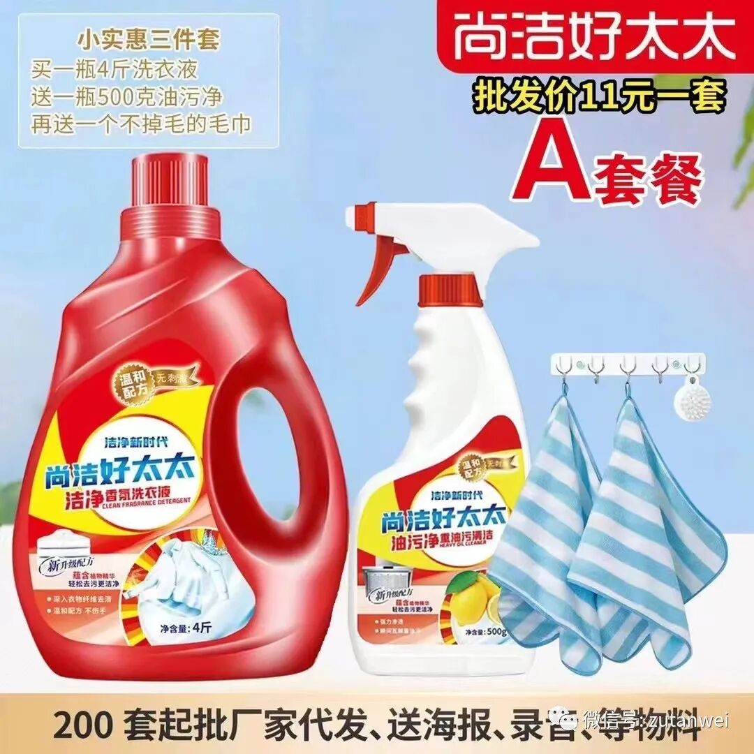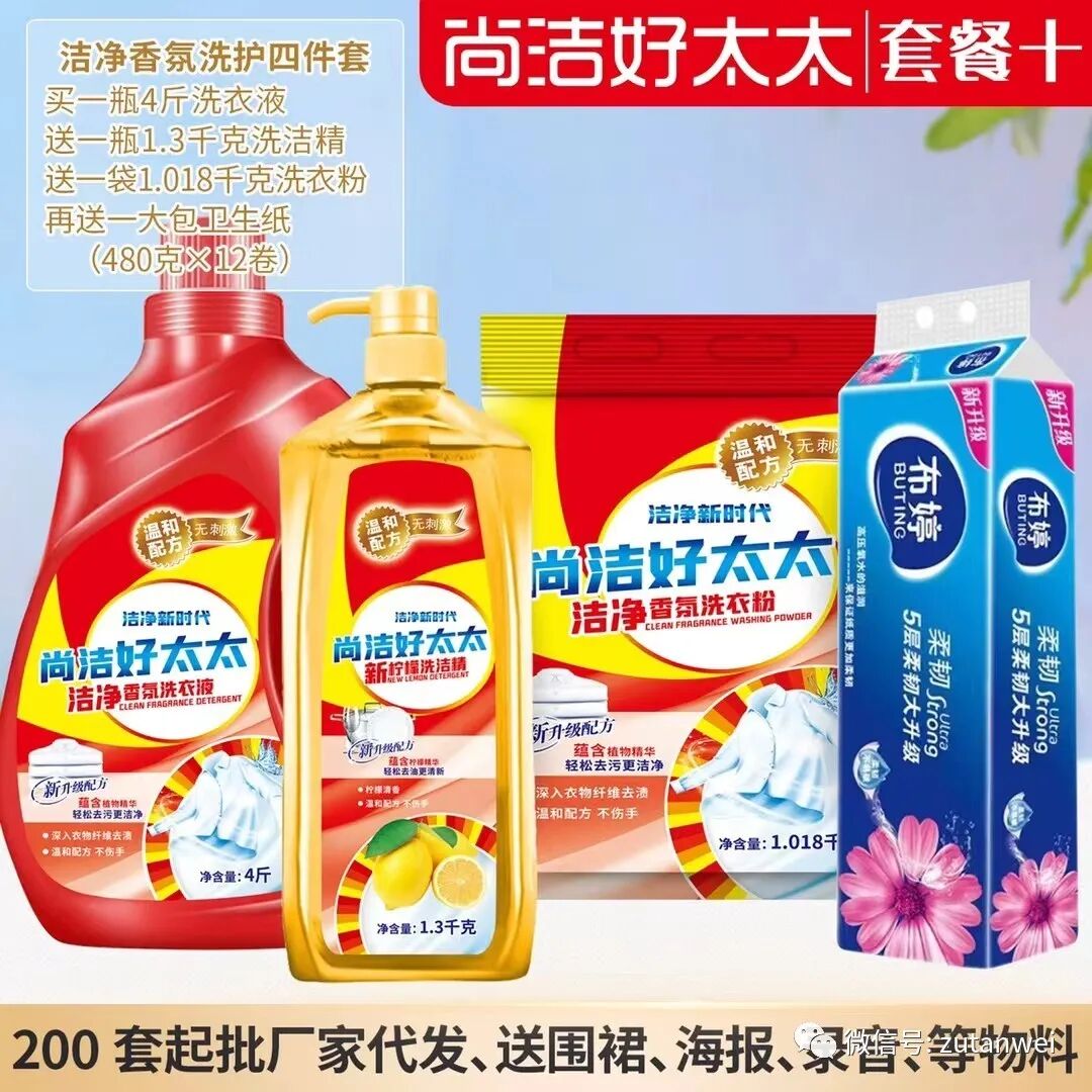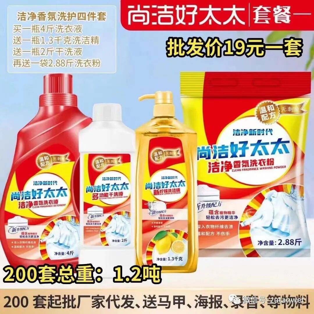 尚洁好太太!四件套!买一瓶四斤重洗衣液!送一瓶1.3公斤洗洁精!送一包二斤重洗衣粉!再送一提卷纸12卷装!昊鑫隆团队10多年来专注地摊货源(小商品)货源批发,公司所有产品都可以混合发货,新客户下单请添加客服微信号:18967406768 老客户直接在微信上咨询下单!2023 年当季热销的货源不断更新中。。。