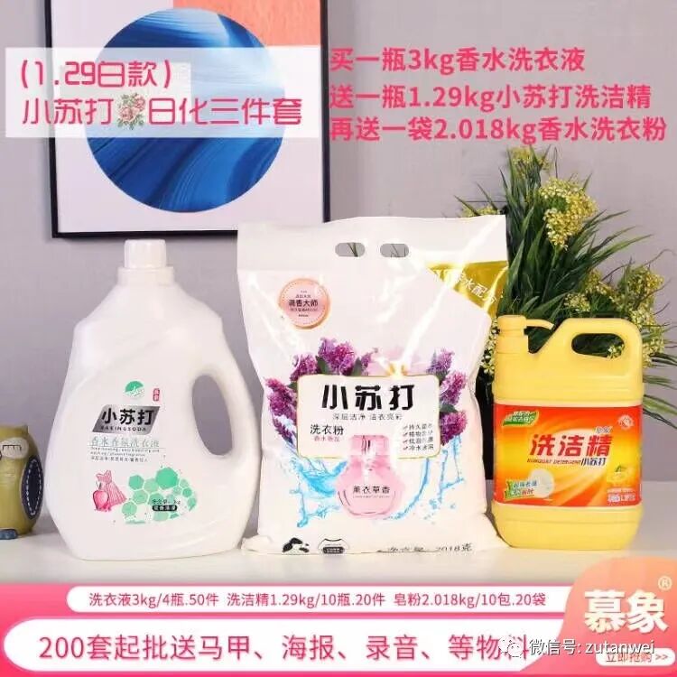产品2:慕象小苏打日化三件件套,皂液日化三件套 慕象小苏打日化三件件套,皂液日化三件套,多种搭配可自选!欢迎订购!送海报 马甲 毛巾墨水 等销售物料!有量就有价,量大私聊!昊鑫隆 昊鑫隆团队10多年来专注地摊货源(小商品)货源批发,公司所有产品都可以混合发货,新客户下单请添加客服微信号:18967406768 老客户直接在微信上咨询下单!2023 年当季热销的货源不断更新中。。。